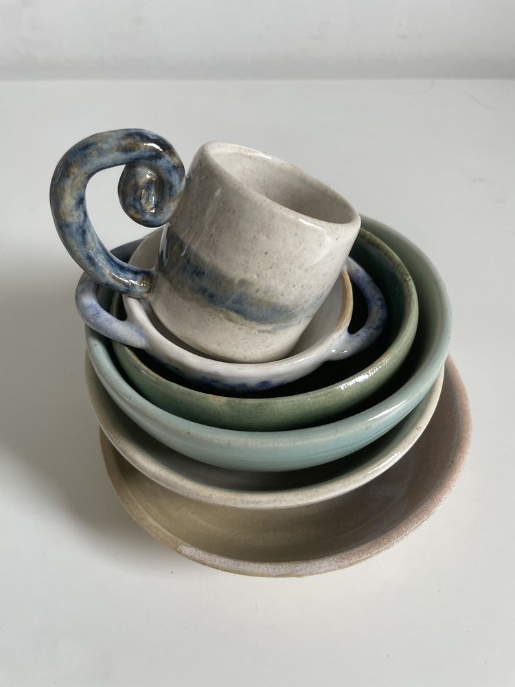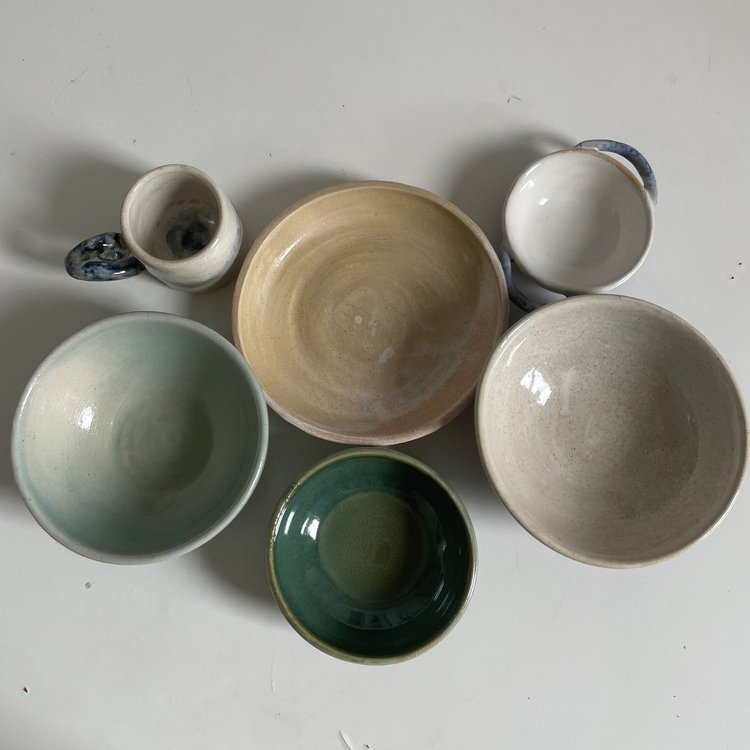 As you can see, everything is very tiny. But I’m really pleased with it all, especially since they’re my first wheel-thrown pieces in many years. They’re all a little wonky (some very much more than others!) and I’m somewhat surprised by how the glaze has come out on some too. However, I really love my little pieces and I am particularly enamoured with the small green bowl (shown second-to-last) which came out so even and glossy and pretty !