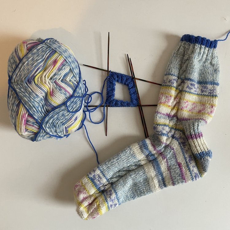 I started this pair of socks from a Paintbox Yarn free pattern and the corresponding pattern a while ago – although it’s not my first pair of socks, it’s my first time doing cabling, which I absolutely love now. Sadly, I suffered from the classic ‘second sock’ issue where I gave up just short of finishing the first sock and didn’t have the motivation to finish the second one. Now I have the motivation, I forgot how much I enjoy knitting socks/double pointed needles (as fiddly as it is). I’ve also discovered a love for knitting cables, since this has been my first time! So, I anticipate this second sock shooting straight off my needles.