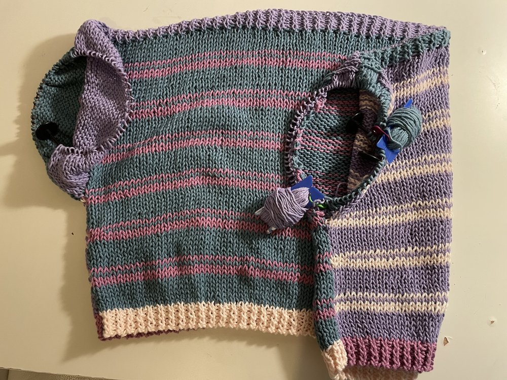 I also finished this t-shirt a while ago, knitted in a really cool mixed/reversible colourway I saw on Instagram (funnily enough also using Paintbox Yarn) but I realised the sleeves were too short so they looked a bit funny, so I had been meaning to go back in and extend them. (I had kind of cocked it up from the beginning by buying the wrong yarn weight and improvising most of it, so it’s impressive it looks as decent as it does.) The trouble with fixing this project is that it’s just way more fun to start new projects… but I figured I do want to actually wear this t-shirt for my efforts, so it’s time to start cutting back into it.