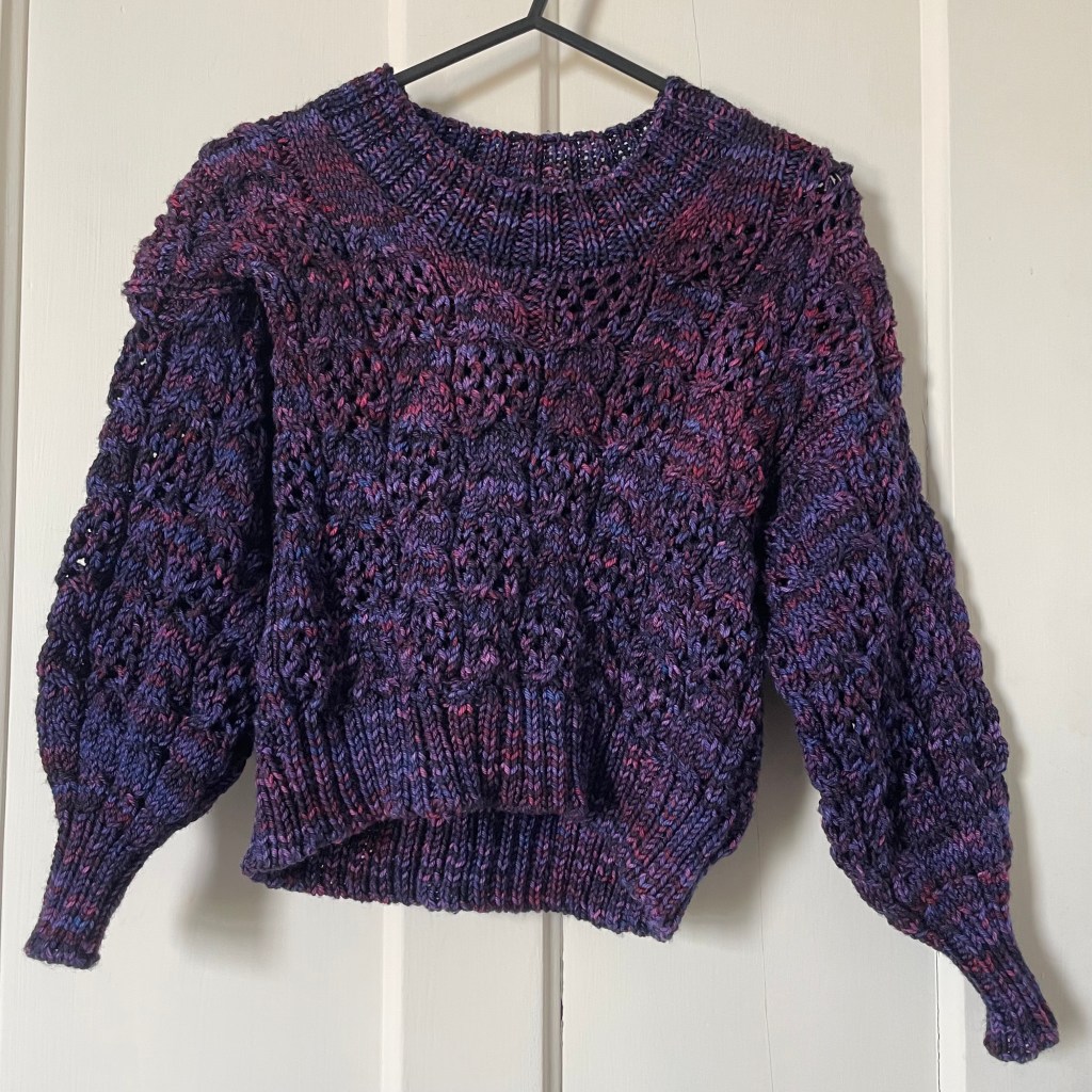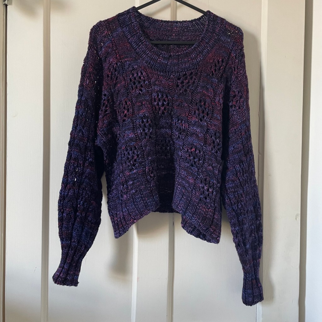 She’s finished! Isn’t she beautiful? The stitch pattern was so fun though the Malabrigo Rios yarn was… a little challenging. As you may be able to see, I had a quite radical difference in dye lots – which I didn’t realise beforehand – and as I worked the dye rubbed off on my hands a little. But it’s still such a nice colour.